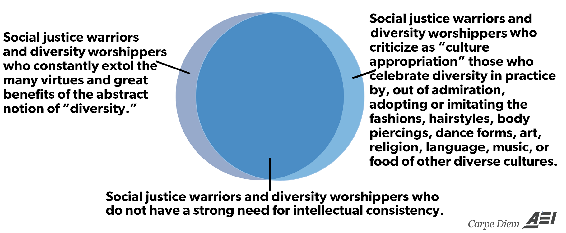 I had a moment of clarity last weekend and realized something. The very same folks that love and laud the benefits of “diversity” (while never really explaining or proving what those benefits are) are the same ones who will hector you to death for engaging in what they call “cultural appropriation.” How can this not be seen as the most fundamental contradiction and blatant intellectual inconsistency (see Venn diagram above)?