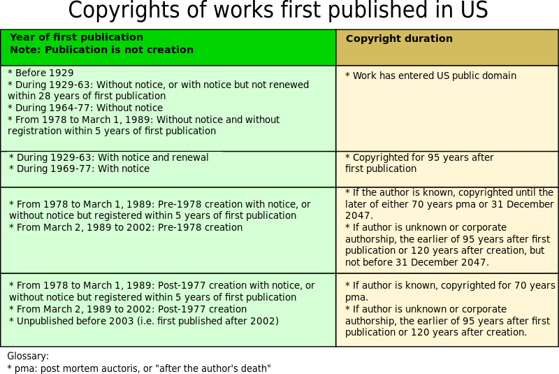 It would be nice if I could give a simple rule explaining how many years it is before works join the public domain, but it isn’t that easy. Depending on the year the work was created and the status of authorship, the rules change. Here’s a simple chart from Wikimedia breaking down the different rules.