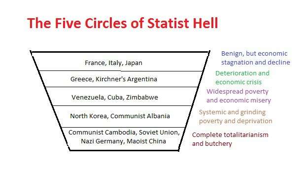 Two years ago, I concocted a visual showing the “Five Circles of Statist Hell” and speculated that Venezuela was getting close to the fourth level. Though I still don’t think it’s nearly as bad as North Korea.