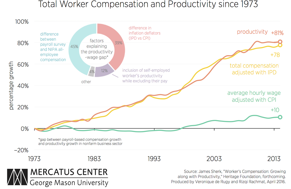 These three factors account for all but 4 percent of the apparent gap between pay and productivity. Over the past generation, employee compensation has risen in step with their productivity.