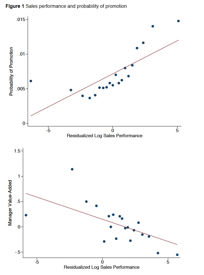 Figure One summarizes the main result: The best salespeople as measured by sales revenue are more likely to be promoted (top) but their value added as managers actually declines in their (pre-promotion) sales revenues (bottom). The result isn’t difficult to believe, the best sales staff do not necessarily make the best managers, the best football players do not necessarily make the best coaches, the best professors do not necessarily make the best deans.