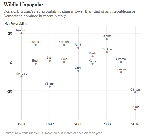 The likely nominees for both major parties have never been more unpopular than they are today. This is one reason that our times seem so grim. The New York Times published this chart to make the point.