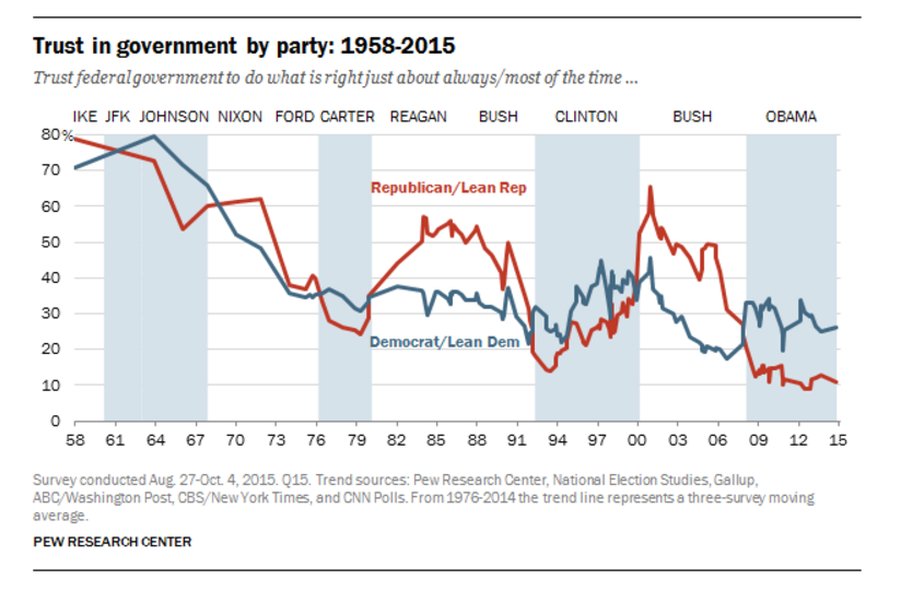 At the same time — no coincidence — government has never been less popular. See this Pew report: