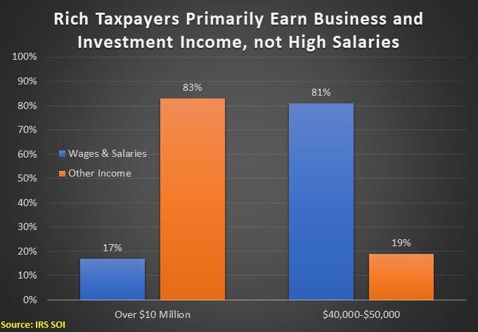 But rich people are different. If you go the IRS’s Statistics of Income website and click on the latest data in Table 1.4, you’ll find that wages and salaries are only a small fraction of the income earned by wealthy taxpayers: