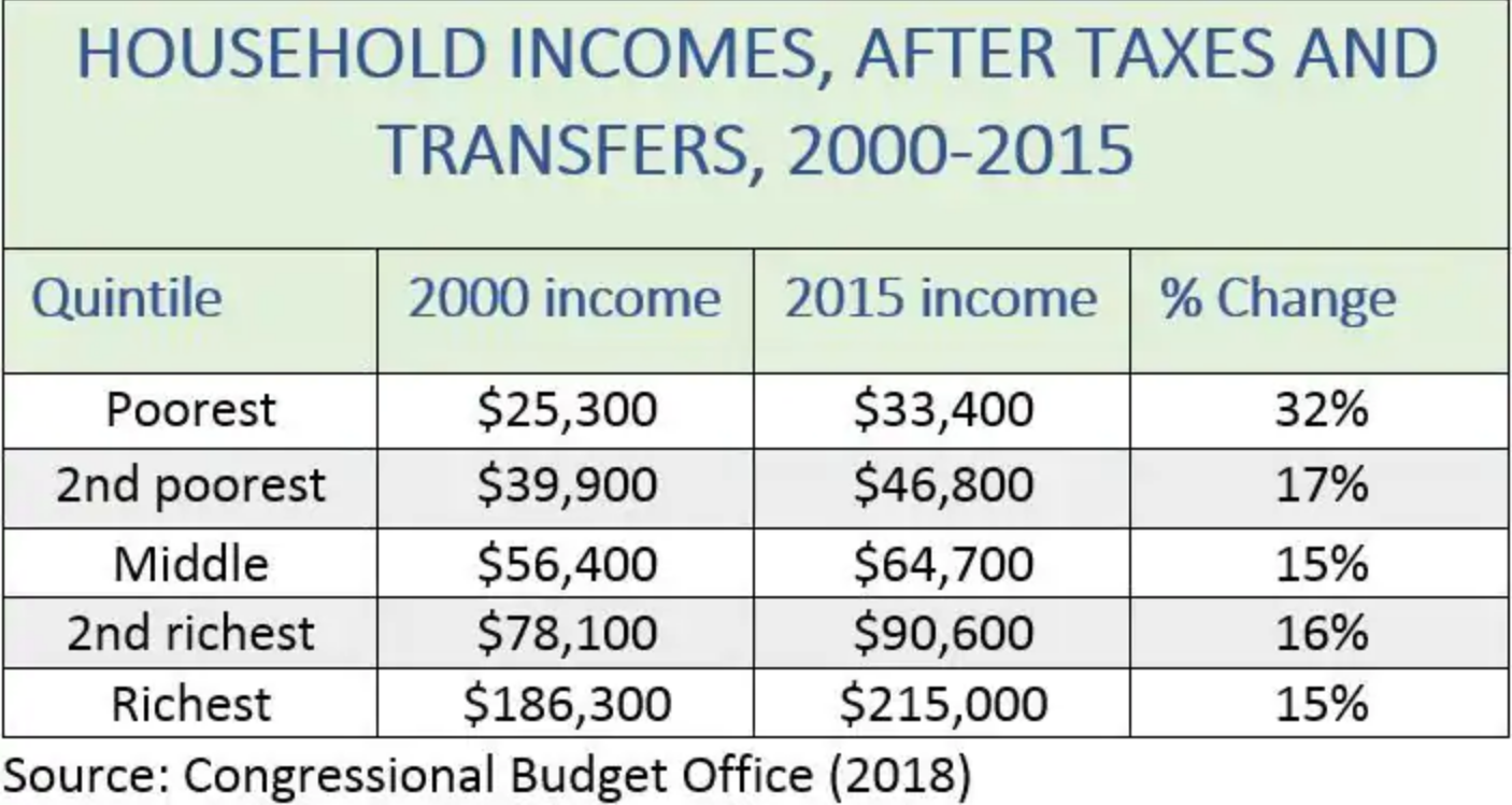 First, there is not a fixed amount of income. The success of a rich entrepreneur does not mean less income for the rest of us. Instead, it’s quite likely that all of us are better off because the entrepreneur created some product or service that we value. Indeed, data from the Census Bureau confirms that all income classes tend to rise and fall simultaneously.