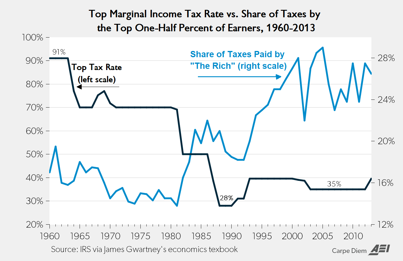 And since I’m a big fan of sensible tax policy and the Laffer Curve, we’re going to share Mark’s new chart looking at the inverse relationship between the top tax rate and the share of taxes paid by the richest Americans: