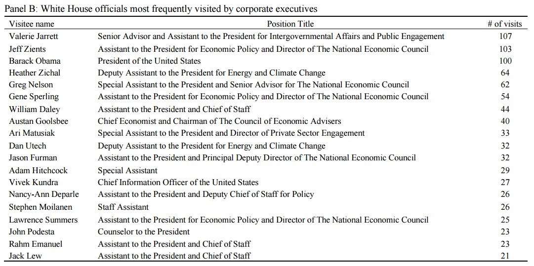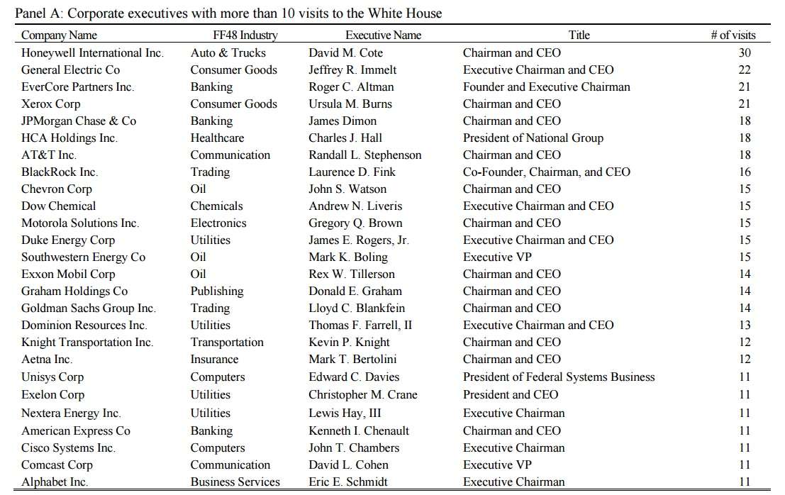 …We match the names of visitors in the White House visitor logs to the names of corporate executives of S&P1500 firms during the period from January 2009 through December 2015. We are able to identify 2,286 meetings between corporate executives and federal government officials at the White House.”