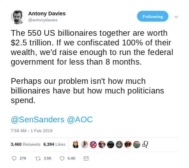 Thankfully (for some), in the democratic-socialist world of Ocasio-Cortez, it doesn’t so much matter as long as they’re morally right. But I submit that those calling for wealth confiscation and an end to billionaires aren’t morally or factually right. If the average man-on-the-street were to demand another’s money on threat of violence, we’d rightly call it theft and demand the thief be punished and the victim made whole. But somehow, if that exact same situation occurs and we simply replace our Average Joe with a government employee, it magically becomes not only legal but laudable?