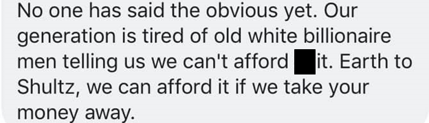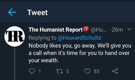 That particular tweet is in reference to the 60 Minutes announcement by former Starbucks CEO Howard Schultz that he’s considering a run for president in 2020. Granted, antipathy toward the wealthy isn’t a new phenomenon. But in the post-Occupy America that we live in, the sentiment of sticking it to the rich has become increasingly more fashionable. All anyone need do is cast a quick glance at the social feeds of progressive darlings like Sens. Bernie Sanders and Elizabeth Warren or, the newest belle of the ball, Rep. Alexandria Ocasio-Cortez, to see the public evidence.