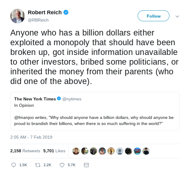 Regardless of Blue Checked opinions, a large percentage of billionaires in this country earned their wealth themselves through entrepreneurship. They saw a need, and they risked their capital to meet that need better than anyone else. Maybe it was the price point of their goods and/or services that attracted customers. Maybe it was the quality. Probably, it was a combination of both. The point is, by enriching the lives of others, by easing complete strangers’ pain points, they were able to enrich themselves.