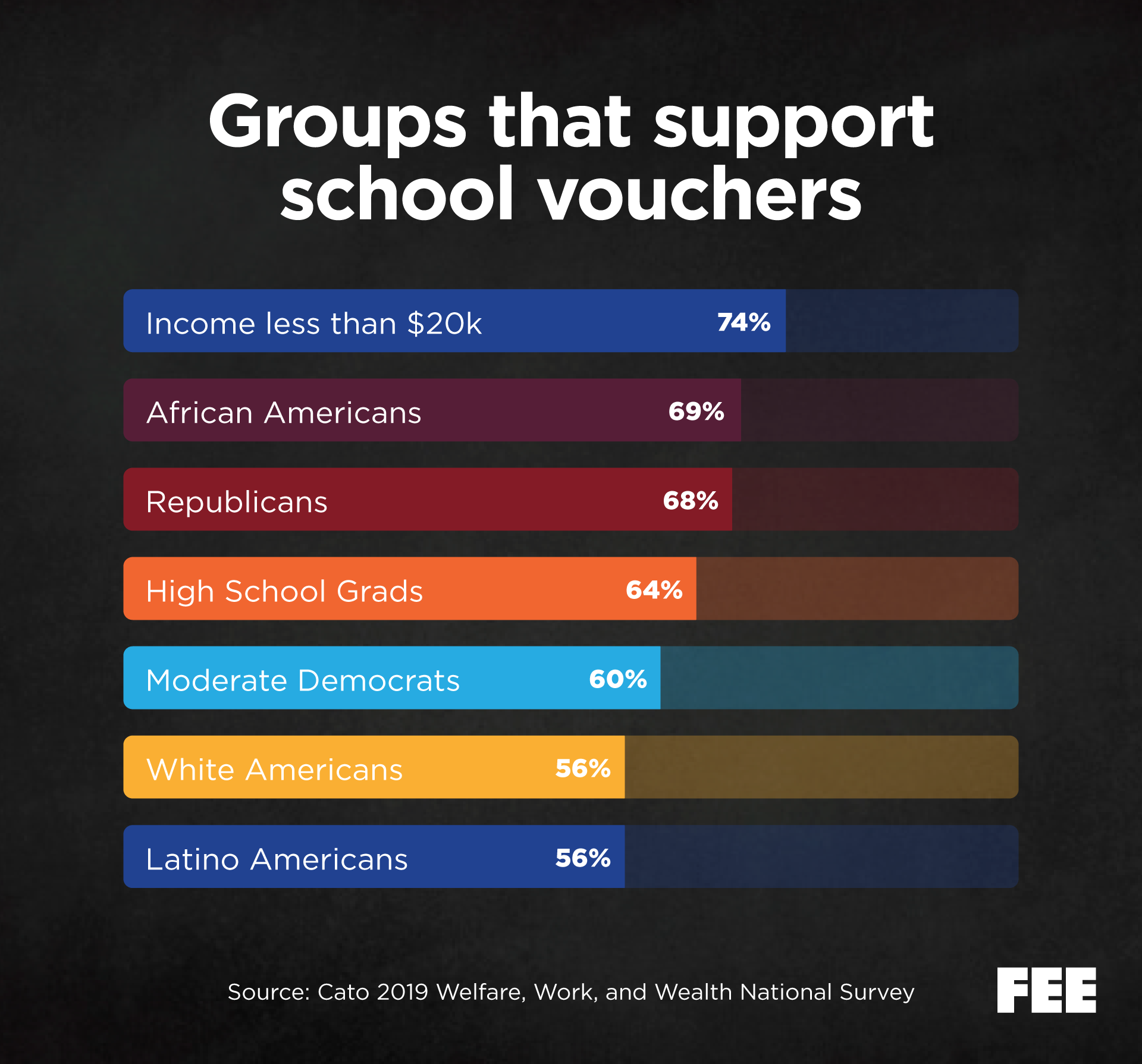 According to recent findings from the “2019 Welfare, Work, and Wealth National Survey,” conducted by the Cato Institute, the majority of Americans (58 percent) support taxpayer-funded K-12 private school vouchers. Some groups are particularly favorable toward vouchers. Responding to the survey question, which asked how respondents feel about a proposal “that would give all families with children in public school a wider choice by allowing them to use a voucher to enroll their children in private schools instead, with government helping to pay the tuition,” African Americans responded most enthusiastically, with 69 percent support.