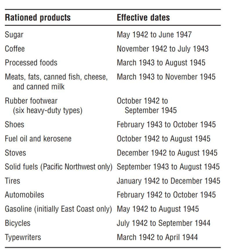 To curb the growing dissatisfaction, the OPA subjected scores of basic goods and services (which accounted for about one-seventh of all consumption spending) to rationing, creating a two-price system. To purchase a rationed good legally, the buyer had to surrender to the seller not only the (controlled) money price but also a stipulated amount of ration coupons or stamps (“points”). The system quickly became complex, and it remained subject to periodic changes and to a variety of exemptions for certain classes of buyers and goods. The table on the next page shows the program’s coverage and duration.
