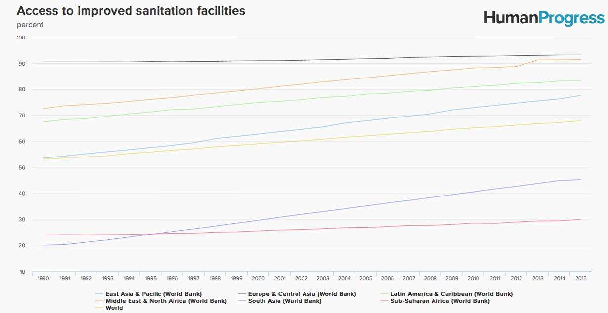Today, poor sanitation is mostly limited to very poor countries. In sub-Saharan Africa, for example, a mere 30 percent of the population had access to improved sanitation facilities in 2015. That was an improvement on 1990 when only 24 percent did. In other parts of the world, progress was much faster.