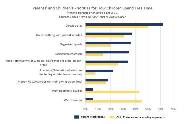 Parents in the Gallup study placed a high value on structured, purposeful play activities – such as organized sports and educational programming. In contrast, these parents reported that their children place a higher value on screen time – perhaps one of the few remaining outlets children have for unsupervised playtime.