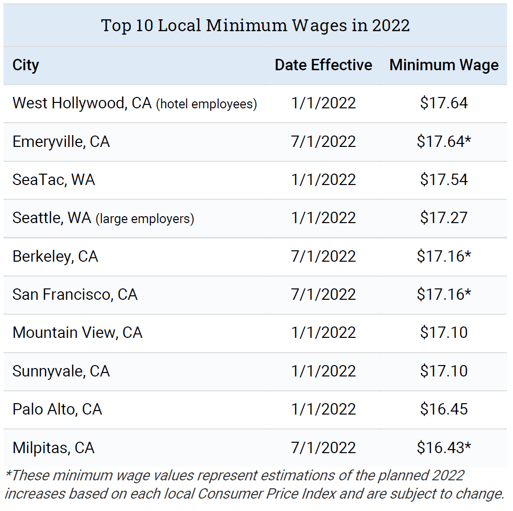 Some places are raising the minimum wage even more sharply at the local level. West Hollywood, California is leading the way in 2022, with a $17.64 minimum wage specifically for hotel employees. Emeryville, California is also enacting an estimated $17.64 minimum wage this year, while in Washington, SeaTac is implementing $17.54 and Seattle is requiring $17.27 among large employers.
