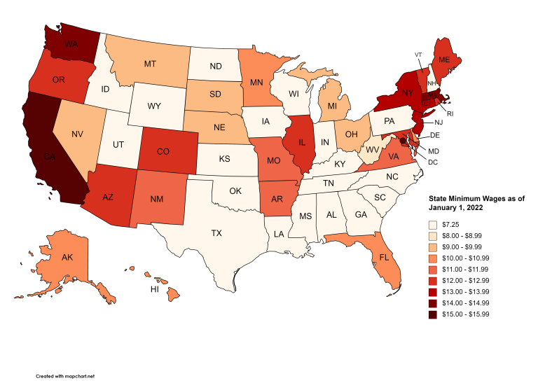 Some places are raising the minimum wage even more sharply at the local level. West Hollywood, California is leading the way in 2022, with a $17.64 minimum wage specifically for hotel employees. Emeryville, California is also enacting an estimated $17.64 minimum wage this year, while in Washington, SeaTac is implementing $17.54 and Seattle is requiring $17.27 among large employers.