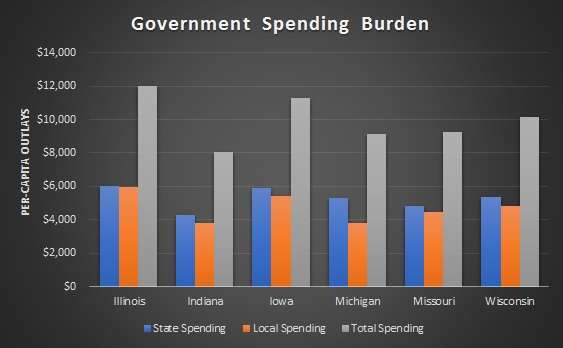 The answer is nothing. Just like the French governments spends far more than the Swiss government without delivering better services, the Illinois government spends far more than the Indiana government without delivering better services.