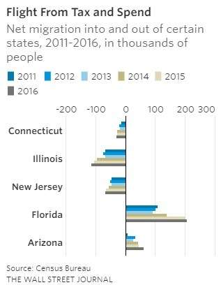 In Illinois, Democrats spent the long weekend coaxing Republican legislators to join their suicide pact to raise taxes to plug a $6 billion deficit… And don’t forget the $130 billion unfunded pension liability  none of which will be solved by the $5 billion tax hike. …The state legislature is controlled by public unions that refuse to compromise. …Pensions will consume about a quarter of Illinois’s general fund this year. Nearly 40% of state education dollars go toward teacher pensions, and the state paid nearly as much into the State Universities Retirement System last year as it spent on higher education. Anemic revenue and economic growth can’t keep up with entitlement spending. The state’s GDP has ticked up by a mere 0.8% annually over the last four years compared to 2% nationwide and 1.4% in the Great Lakes region. Since 2010 more than 520,000 Illinois residents on net have fled to other states.