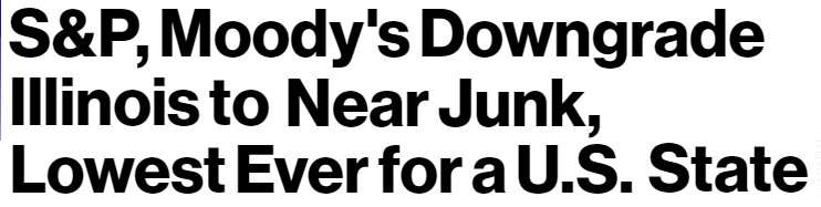Illinois had its bond rating downgraded to one step above junk by Moody’s Investors Service and S&P Global Ratings, the lowest ranking on record for a U.S. stateIllinois’s underfunded pensions and the record backlog of bills… are equivalent to about 40 percent of its operating budget… investors have demanded higher premiums for the risk of owning its debt. Moody’s called Illinois “an outlier among states” after suffering eight downgrades in as many years… like other states, has no ability to resort to bankruptcy to escape from its debts. A downgrade to junk, though, would add further financial pressure by increasing its borrowing costs.