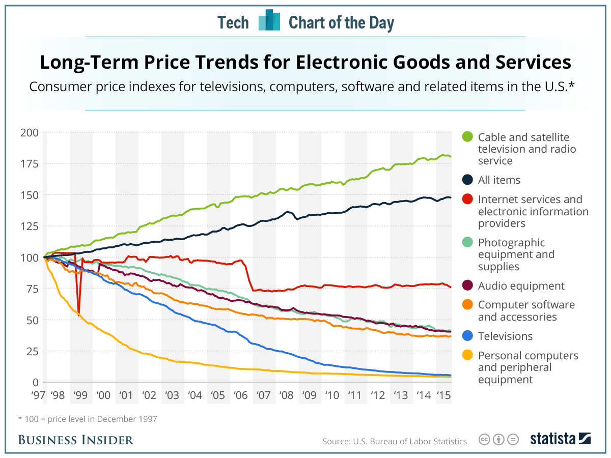 Bonus chart: almost all tech is getting a lot cheaper, except cable television.