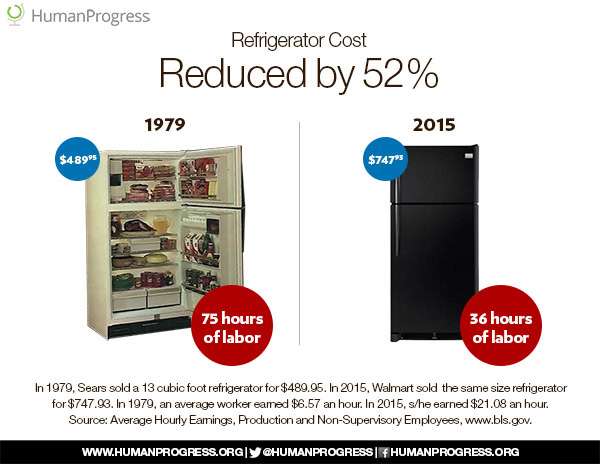When cost is measured in terms of hours worked, almost everything in 2015 is “on sale” when compared to the same product in 1979.