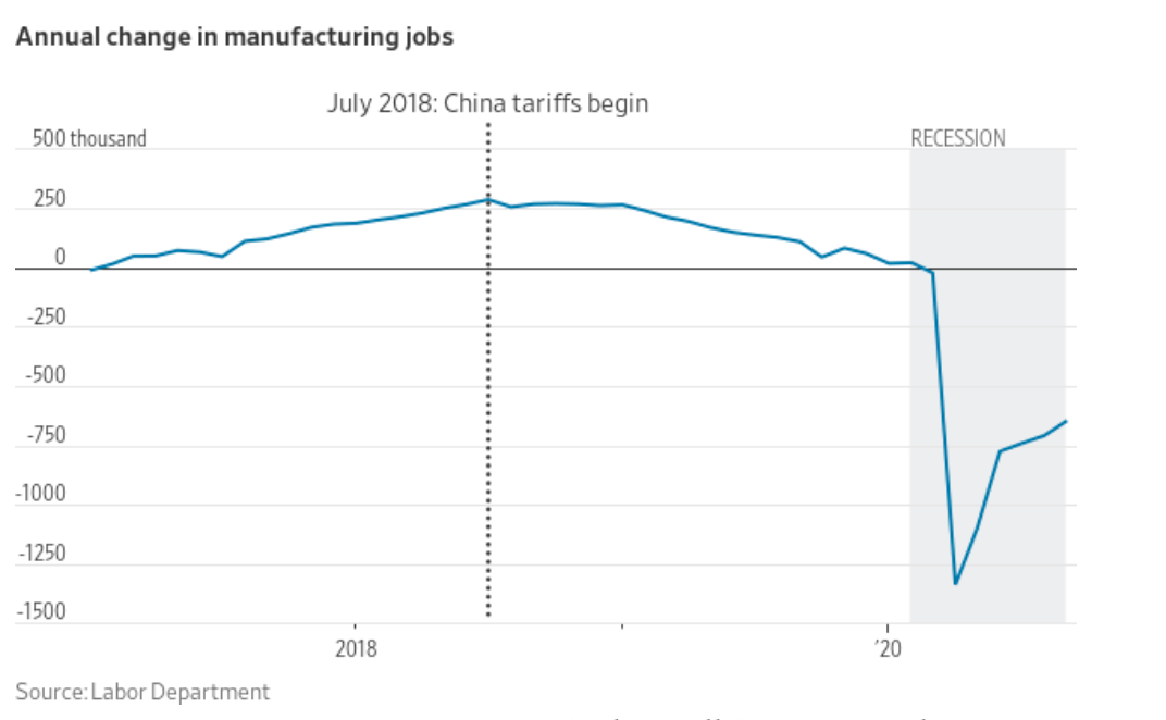 Why? It’s simple: The tariffs helped some manufacturers by hurting others via raised prices, and (predictably) triggered retaliatory tariffs from China that together outweighed any benefits.The problem with tariffs generally speaking is that they kill more jobs than they create.