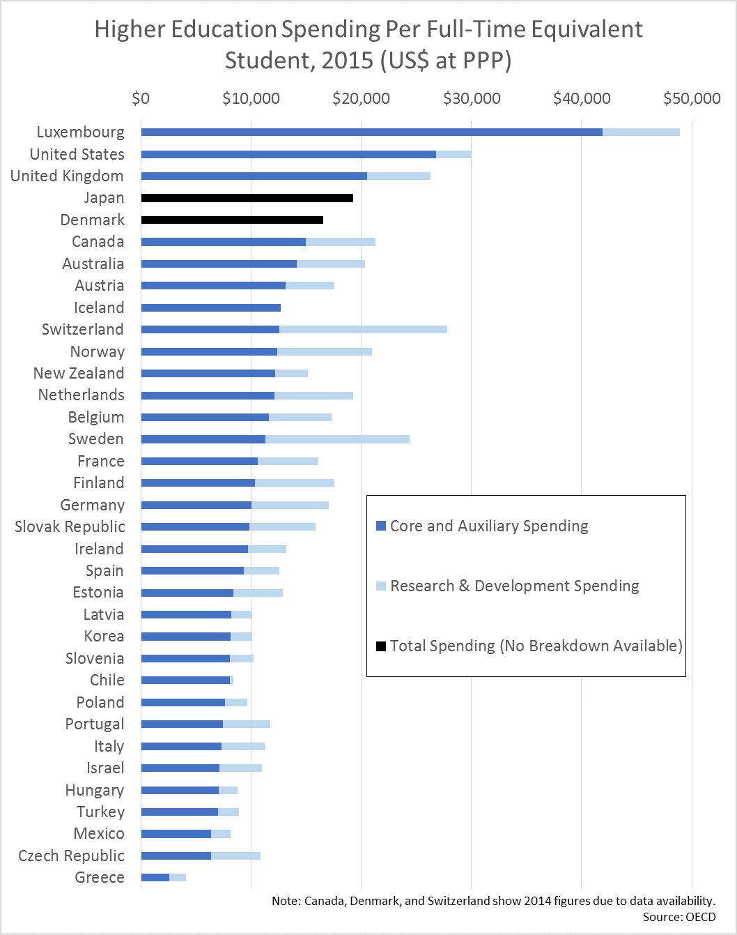 The American higher education system splashes out nearly $27,000 per student on core and auxiliary educational services. This figure includes spending on instruction, administration, and ancillary services such as dormitories and dining halls. Another $3,000 per student goes to research and development spending. Only tiny Luxembourg, an affluent grand duchy in Western Europe, spends more per college student than the United States.
