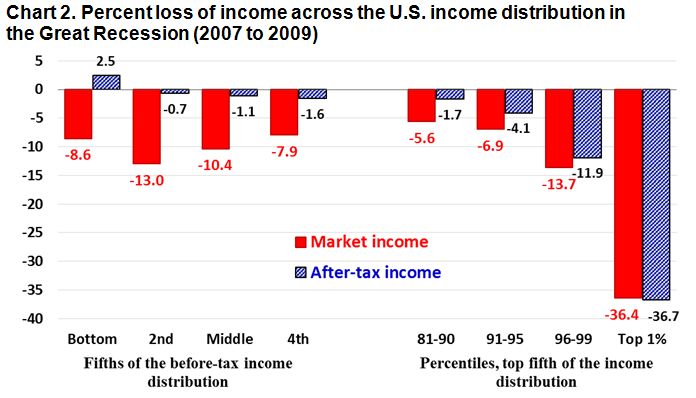 Among households in the middle fifth of the before-tax income distribution, average market income fell more than 10 percent in the Great Recession. If we include government transfers in the income definition, average income fell 4.4 percent. If we account for the federal taxes families pay, average net income fell just 1 percent.