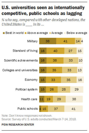 As the chart below demonstrates, Pew asked respondents to compare various institutions with those in other nations. The American military got the biggest raves, followed by standard of living and scientific achievements. Public schools, however, were at the bottom. In fact, a whopping 41 percent of respondents rated America’s public schools below average when compared to those in other countries.