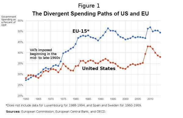 And that’s the reason I am vociferously opposed to the VAT. I don’t think it’s a coincidence that the burden of government spending dramatically increased in Europe once politicians got their hands on a new source of revenue.
