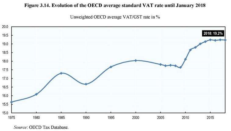 VAT revenues have reached historically high levels in most countries… Between 2008 and 2015, the OECD average standard VAT rate increased by 1.5 percentage points, from 17.6% to a record level of 19.2%, accelerating a longer term rise in standard VAT rates… VAT rates were raised at least once in 23 countries between 2008 and 2018, and 12 countries now have a standard rate of at least 22%, against only six in 2008… Raising standard VAT rates was a common strategy for countries…as increasing VAT rates provides immediate revenue.