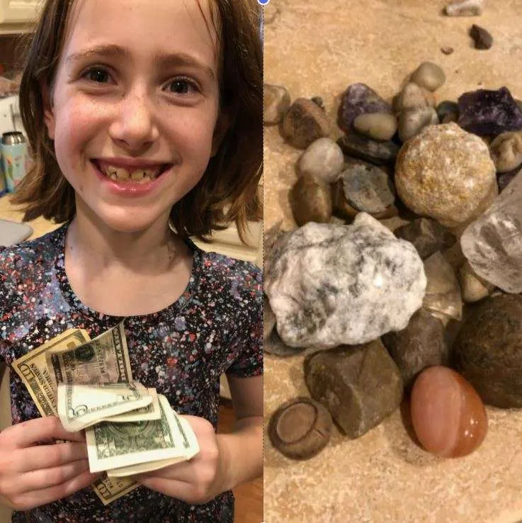On Sunday, she and her friend started digging around the yard for “buried treasures,” and curated a collection of pebbles, rocks, pennies, and acorns. Between these two kids, the idea was hatched that they could actually sell these items to neighbors by walking door to door. By the time they were finished, they had collected $58, which they split between them evenly and used to immediately buy treats from a nearby ice cream truck.