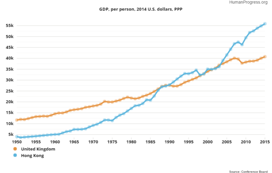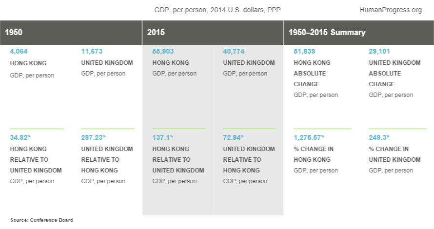 In 1950, an average citizen of the city earned 35 percent as much as an average citizen of Hong Kong’s colonial master, Great Britain. In 2015, an average citizen of Hong Kong earned 37 percent more than a typical Briton. The poverty that Gellhorn bemoaned is gone — thanks to economic freedom and peace.