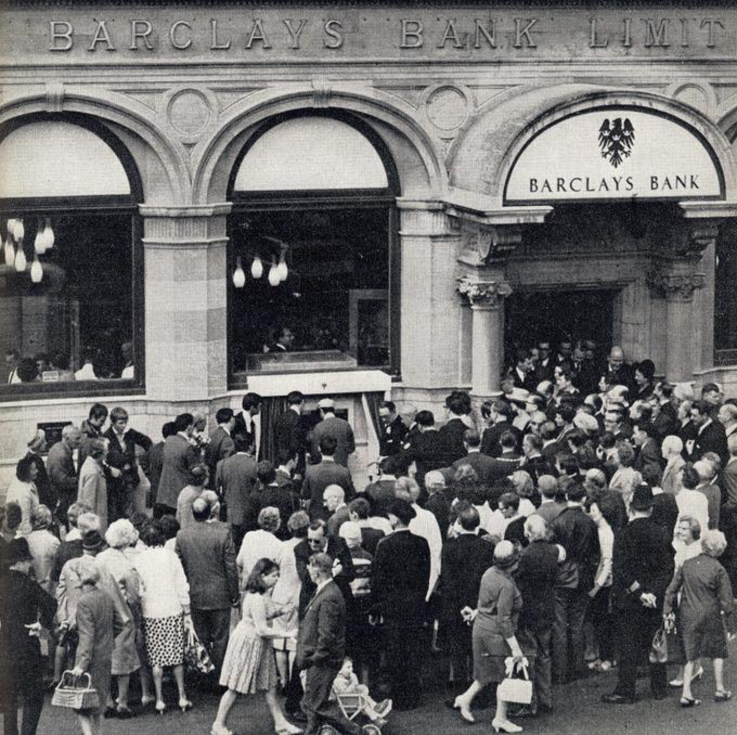 People scramble to get a look at the world’s first ATM. Credit: PA Archive