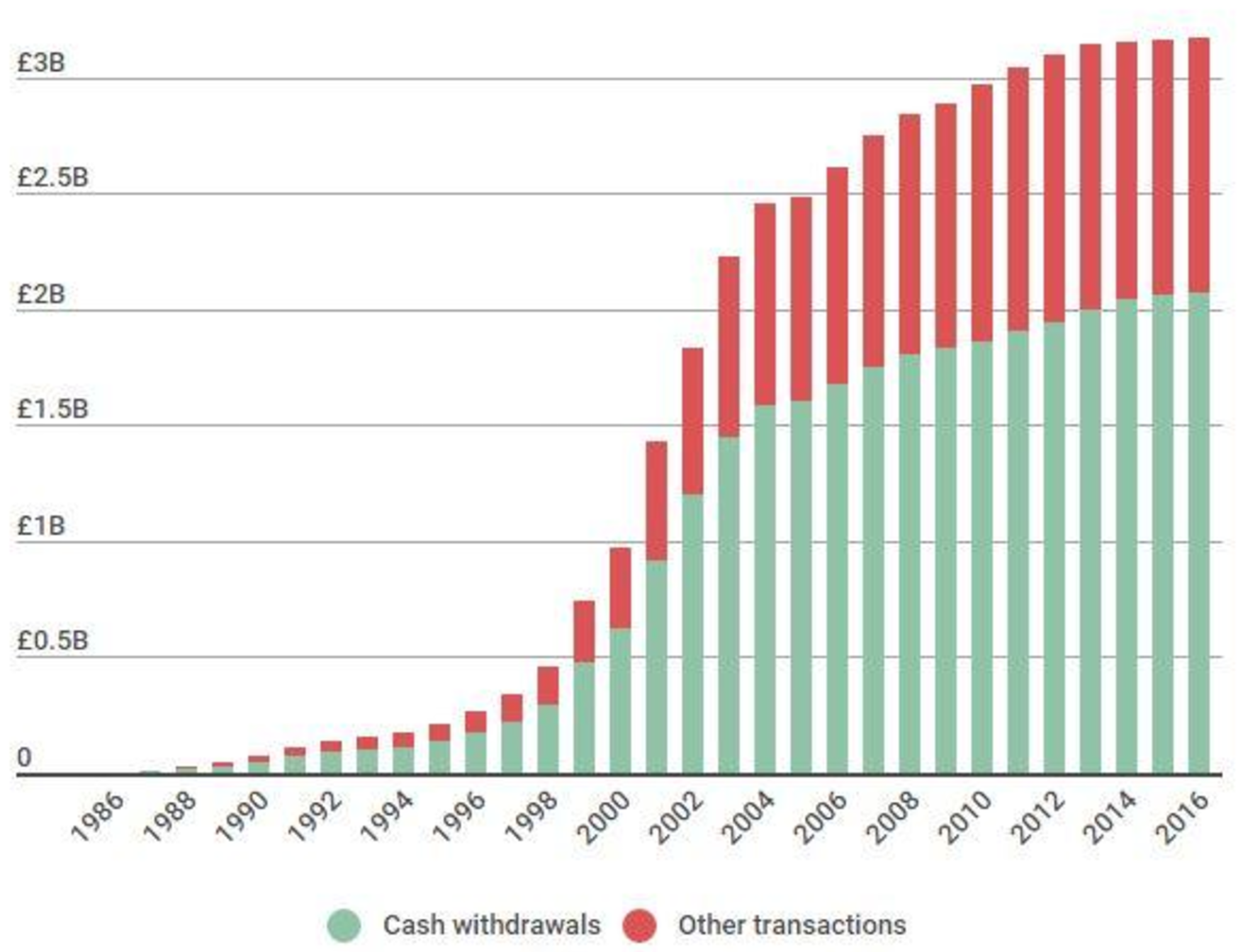 The following graph shows how spending habits have changed over the last 30 years. With society adopting new ways of payment, how can ATMs remain useful and relevant?