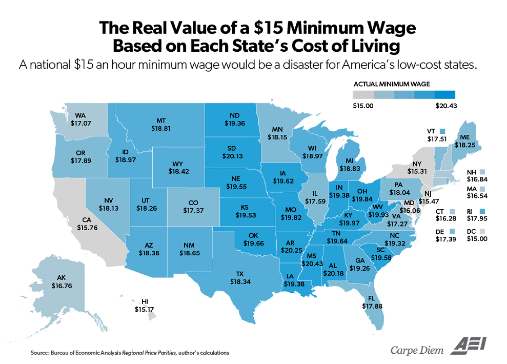 For example, if $15 an hour was considered to be a minimum wage that might have minimal negative employment effects in the highest-cost areas of the US, like DC, the cost of living adjusted minimum wage for states like South Dakota, Alabama, Arkansas, and Mississippi should be only about $11 an hour. But at $15 an hour, the minimum wage could have huge negative employment effects on communities in those states.