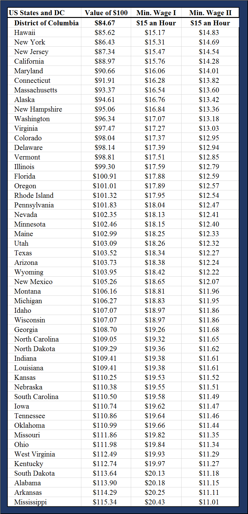 But another issue is that this large variation in cost of living changes the effective value of a minimum wage. Based on these numbers, a $15 minimum wage in Washington DC becomes, effectively, a $20.43 minimum wage in Mississippi.