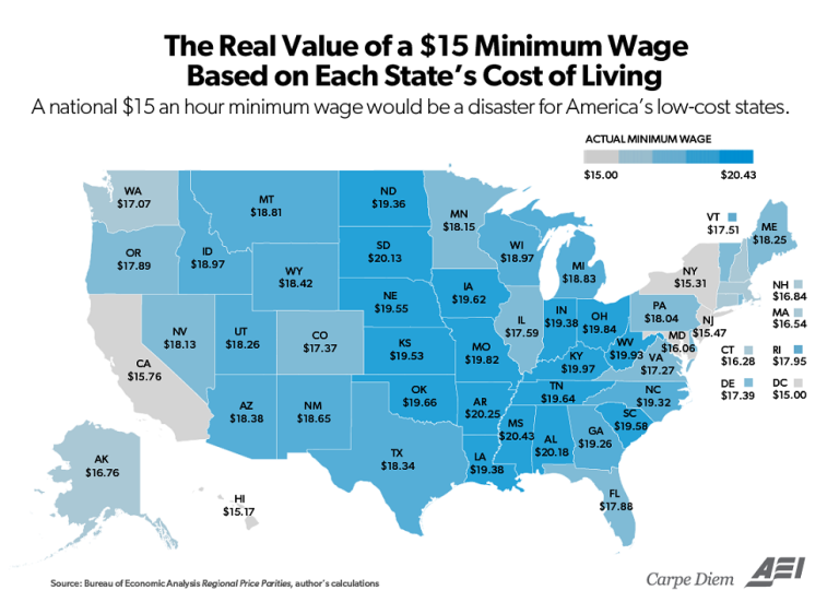 For example, if $15 an hour was considered to be a minimum wage that might have minimal negative employment effects in the highest-cost areas of the US, like DC, the cost of living adjusted minimum wage for states like South Dakota, Alabama, Arkansas, and Mississippi should be only about $11 an hour. But at $15 an hour, the minimum wage could have huge negative employment effects on communities in those states.