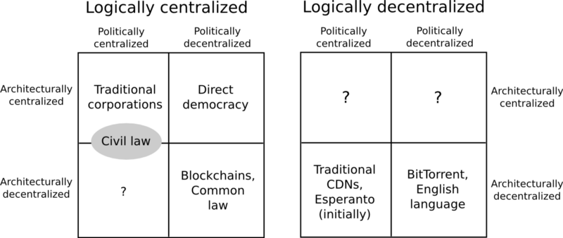 Logical centralization makes architectural decentralization harder, but not impossible — see how decentralized consensus networks have already been proven to work, but are more difficult than maintaining BitTorrent. And logical centralization makes political decentralization harder — in logically centralized systems, it’s harder to resolve contention by simply agreeing to “live and let live”.