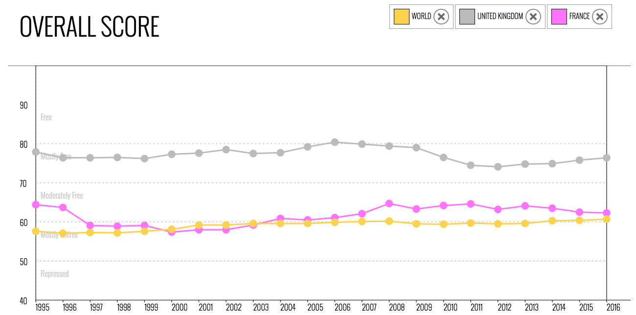 In the Heritage Foundation Business Freedom Index, France is ranked as being “moderately free,” a devastating regional ranking for Europe as 32nd out of 44. Comparing its overall score to the United Kingdom easily visualises the situation, since France barely manages to keep itself above the global average (with all the incredible unfree countries that includes).