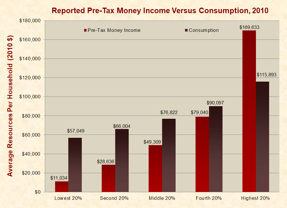 The federal data graphed above show that the poorest 20% of U.S. households consumed an average of $57,049 of goods and services per household in 2010, while they reported an average of $11,034 in pre-tax money income to the Census Bureau. This means that widely reported federal poverty stats exclude about 80% of the material resources of low-income households. Put simply, the poorest fifth of U.S. households consume five times more goods and services than the poverty stats reveal.