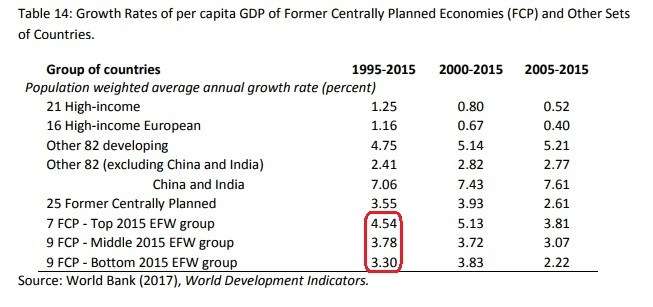 The economic record of the FCP countries during 1995-2015 was impressive. This was particularly true for the seven FCP countries that moved the most toward economic liberalization. The average growth of real per capita GDP of these seven countries exceeded 5 percent during 1995-2015. Real per capita GDP more than doubled in six of the seven countries during the two decades. …While the real GDP growth of the middle group was slower, it was still impressive. The population weighted annual real growth of per capita GDP of the middle group was 3.78 percent.