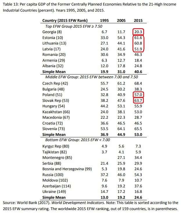 And you can see, once again, that the nations with the most economic freedom and enjoying the fastest convergence rates. From the top group, I’ve highlighted both Georgia and the Baltic countries for their impressive results. And I also highlighted Poland and Slovakia from the second group because both countries have converged at a rapid pace thanks to some good policies.