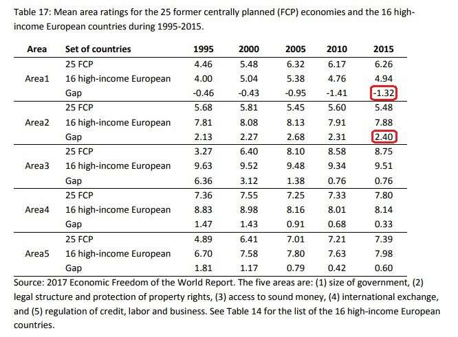 Here’s some fascinating data from Table 17, which shows how scores for the five major categories have changed over time in both FCP nations and countries from Western Europe. You’ll see that FCP countries have liberalized policy and closed the gap in Area 3 (money), Area 4 (trade), and Area 5 (regulation). And you’ll also see how the FCP nations do a better job in Area 1 (fiscal), which I’ve highlighted in red. But the most startling – and depressing – result in the absence of progress in Area 2 (legal), which is also highlighted in red.