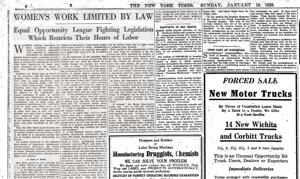 At the time, the women’s movement was dedicated to repealing this law. As the New York Times reported on January 18, 1920, women “have begun a determined fight to prevent the passage by the New York State Legislature of three new labor measures and for the repeal of two laws limiting hours of employment.”