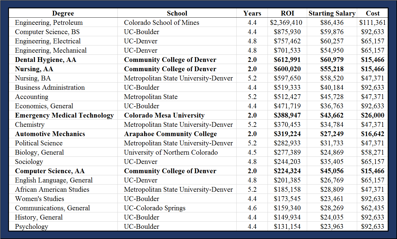 Based on data obtained from the website, the table above (click to enlarge) displays a sample of various 2-year and 4-year college degrees from colleges in Colorado, along with the average number of years to complete the degree, the ROI (from highest to lowest), the starting post-graduate salary, and the total student cost to earn the degree.