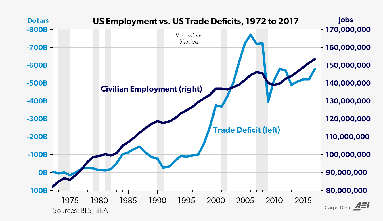 Well, Mr. Morici, consider these facts: 1) Between 1997 and 2003, the US trade deficit increased by a factor of 5X from roughly $100 billion to $500 billion during a period when US employment increased by more than 8 million and by more than 6%. Between 2003 and 2008, the US trade deficit increased by nearly 44% and by $220 billion, while the US added 7.6 million jobs. And between 2009 and 2017, US employment increased by more than 13 million in the post-recession recovery while the trade deficit increased by $182 billion and by 46%.