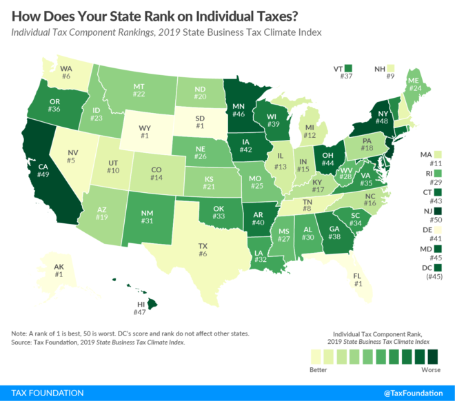 For most states in the United States, the primary means by which state governments take money from their residents is through income taxes. As part of its 2019 State Business Tax Climate Index, the 81-year-old nonpartisan Tax Foundation has ranked U.S. states according to their individual income tax burden, which is the heaviest-weighted component of their state business tax climate index. The following map shows where each state has ranked according to state income taxes going into 2019.