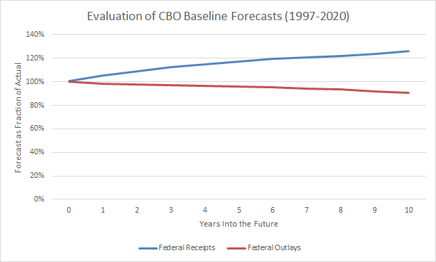 From 1997 to the present, the CBO has made 198 revenue projections that we can compare to what actually happened. When projecting one year into the future, CBO’s revenue projections are too high by an average of five percent. When projecting five years into the future, their revenue projections are too high by an average of 17 percent, and when projecting ten years into the future, their projections are too high by an average of 26 percent.