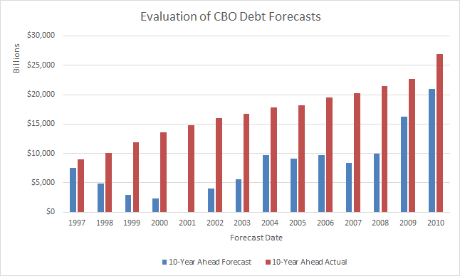 Consistently over-predicting receipts while under-predicting expenditures results in all manner of trouble, especially when the numbers in question are produced at the behest of Congress, which has never been particularly budget conscious. And the differences between the CBO’s predictions and reality are a lot more problematic than they first appear to be, manifesting in ever more federal debt with each predictive misfire.